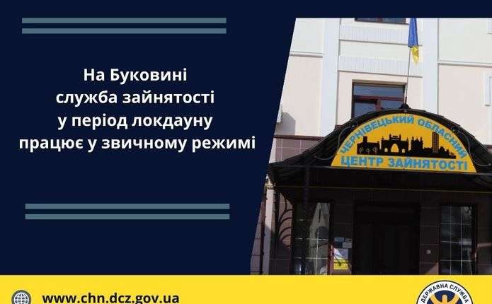 У період посилених карантинних обмежень, які діють в Україні з 8 до 24 січня 2021 року, філії Чернівецького обласного центру зайнятості працюватимуть у звичному режимі. Про це повідомляє сектор інформаційної роботи обласного центру зайнятості.