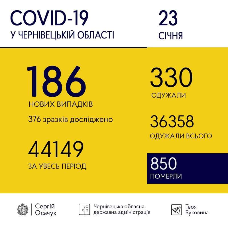 Як передає голова Чернівецької ОДА Сергій Осачук, у Чернівецькій області за минулу добу виявили 186 нових випадків.