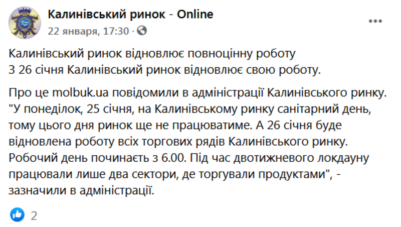“А 26 січня буде відновлена роботу всіх торгових рядів Калинівського ринку. Робочий день починаєть з 6.00. Під час двотижневого локдауну працювали лише два сектори, де торгували продуктами”, – йдеться у повідомленні.