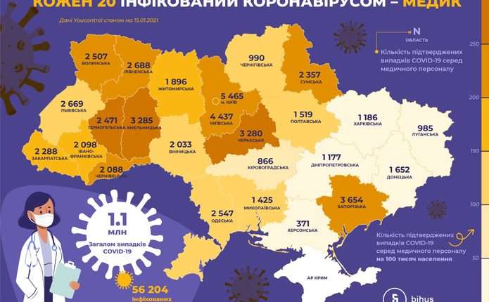 З 1,1 млн випадків СOVID-19 – 56 тисяч 204 випадки підтверджено у медичних працівників. Тобто кожен 20-ий інфікований коронавірусом – медик. Про це повідомляє Bihus.Info.