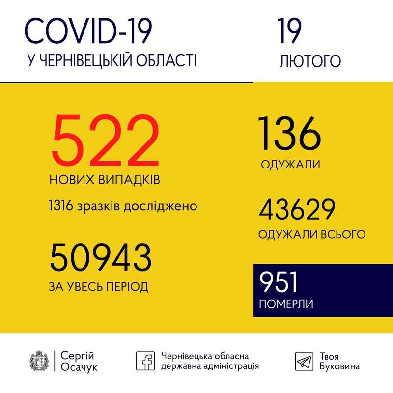 19 лютого на Буковині виявили 522 нових випадки коронавірусу.