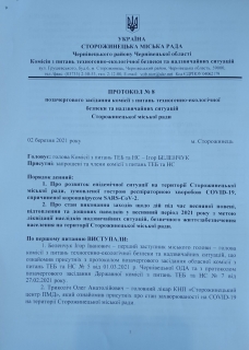 Сторожинецька міська рада провела засідання комісії з питань ТЕБ та НС. Відповідно до постанови КМУ №1236 з усіма змінами та доповненнями було заборонено роботу усіх суб’єктів господарювання згідно виду діяльності відповідно до цієї постанови та додатково прийнято рішення не відновлювати навчання у навчальних закладах, крім дитячих садків, у зв’язку із збільшенням захворюваності на COVID-19.