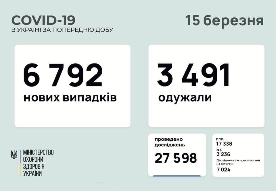 В Україні за добу зафіксували 6 792 нових випадки COVID-19, повідомив Міністр охорони здоров’я Максим Степанов.