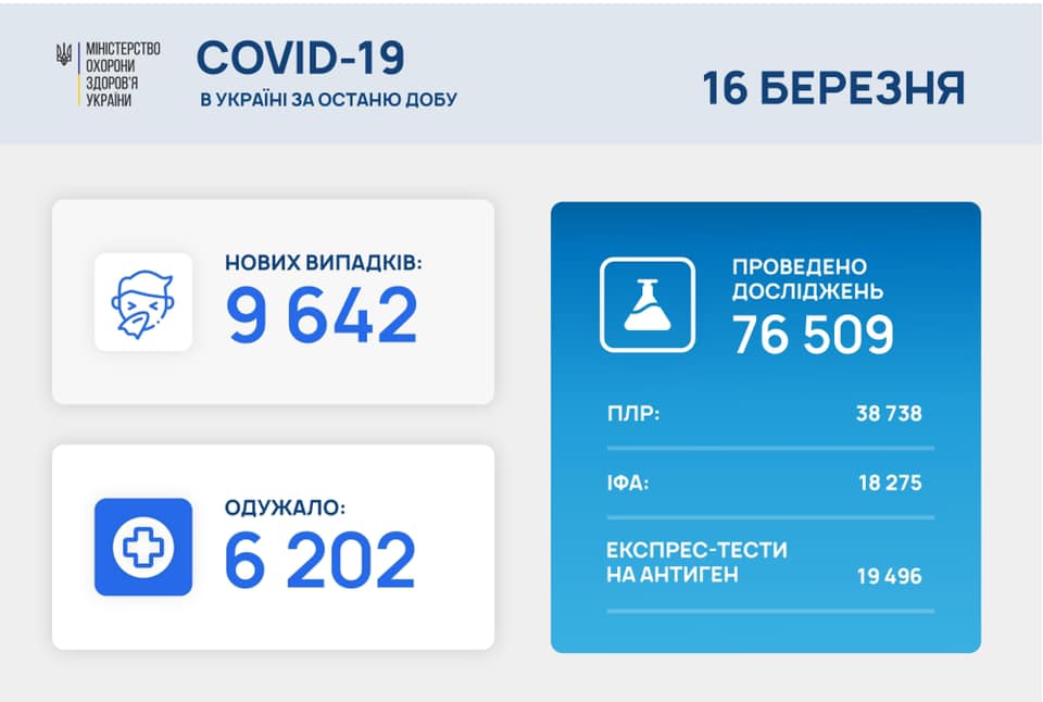 Станом на ранок 16 березня в Україні зафіксували 9 642 нових випадків коронавірусної хвороби COVID-19. Зокрема, захворіли 474 дитини та 313 медпрацівників.