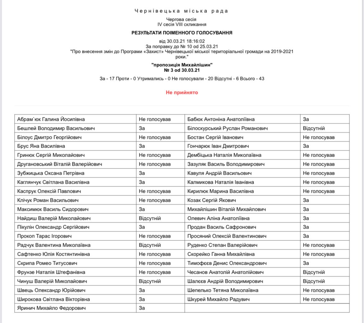 Віталій Михайлішин повторно просив включити у програму пункт про надання матеріальної допомоги малозабезпеченим чернівчанам, але більшість Клічука знову проігнорувала соціальну ініціативу. Підтримали пропозицію лише 17 депутатів, чого було недостатньо для прийняття рішення.