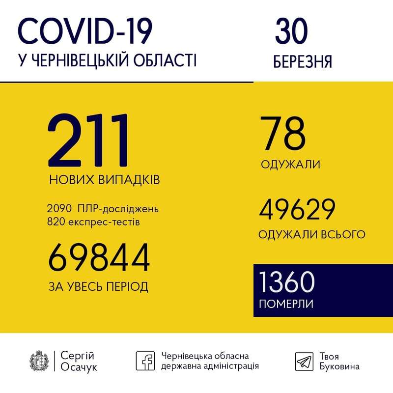 У Чернівецькій області зафіксували 211 нових випадків інфікування COVID-19.