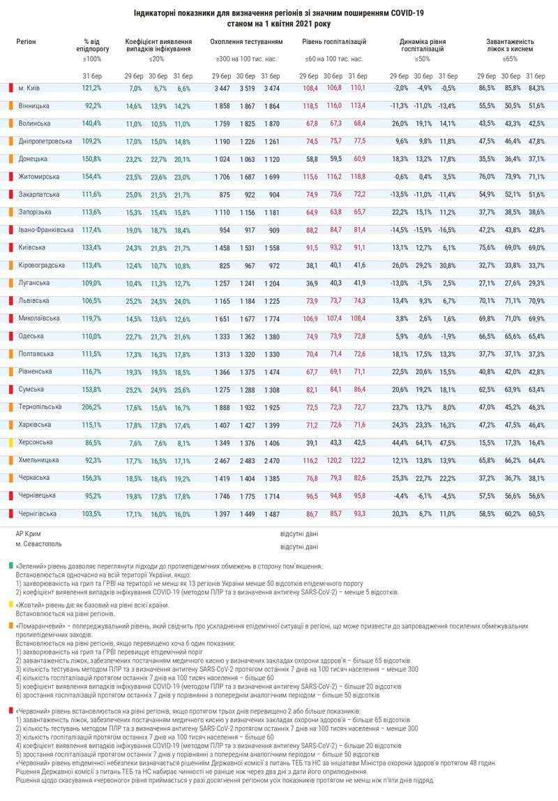 Поділ на зони за рівнем епідемічної небезпеки щодо поширення COVID-19 станом на 1 квітня, зважаючи на показники, виглядає так: