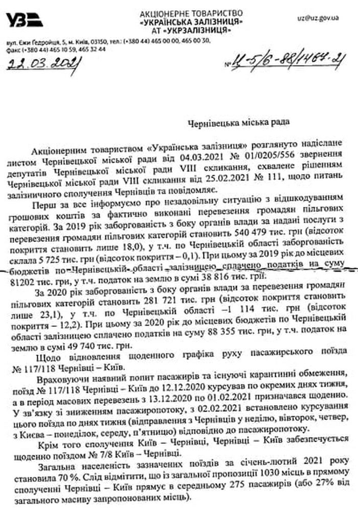 Проблема залізничного сполученням Чернівців з українськими містами не нова, а після того як «Укрзалізниця» скоротила кількість потягів з столиці Буковини, місто опинилось, по суті, в транспортній ізоляції. У Чернівців залишилось залізничне сполучення лише з Києвом, Львовом та Одесою, та й те не щоденне. Звісно, що такі проблеми потребують прискіпливої уваги з боку міської влади та негайного вирішення шляхом перемовин з керівництвом «Укрзалізниці». Однак нова міська влада пішла іншим шляхом і замість перемовин вирішила… заспамити «Укрзалізницю» листами з вимогою запровадити кілька нових потягів на Чернівці.