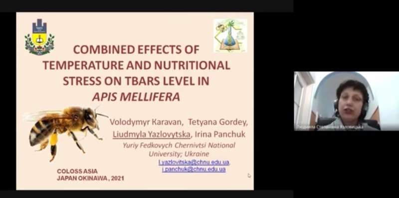 Людмила Язловицька представила доповідь «Combined effects of temperature and nutritional stress on TBARS level in Аpis mellifera» (презентація доступна за посиланням: https://youtu.be/E592i8JwGYo), присвячену утриманню бджіл при різних температурних режимах на різноманітних вуглеводних дієтах. Поєднання температурного та харчового стресу призводить до окислювальних процесів у клітинах, що негативно впливає на здоров’я бджіл.