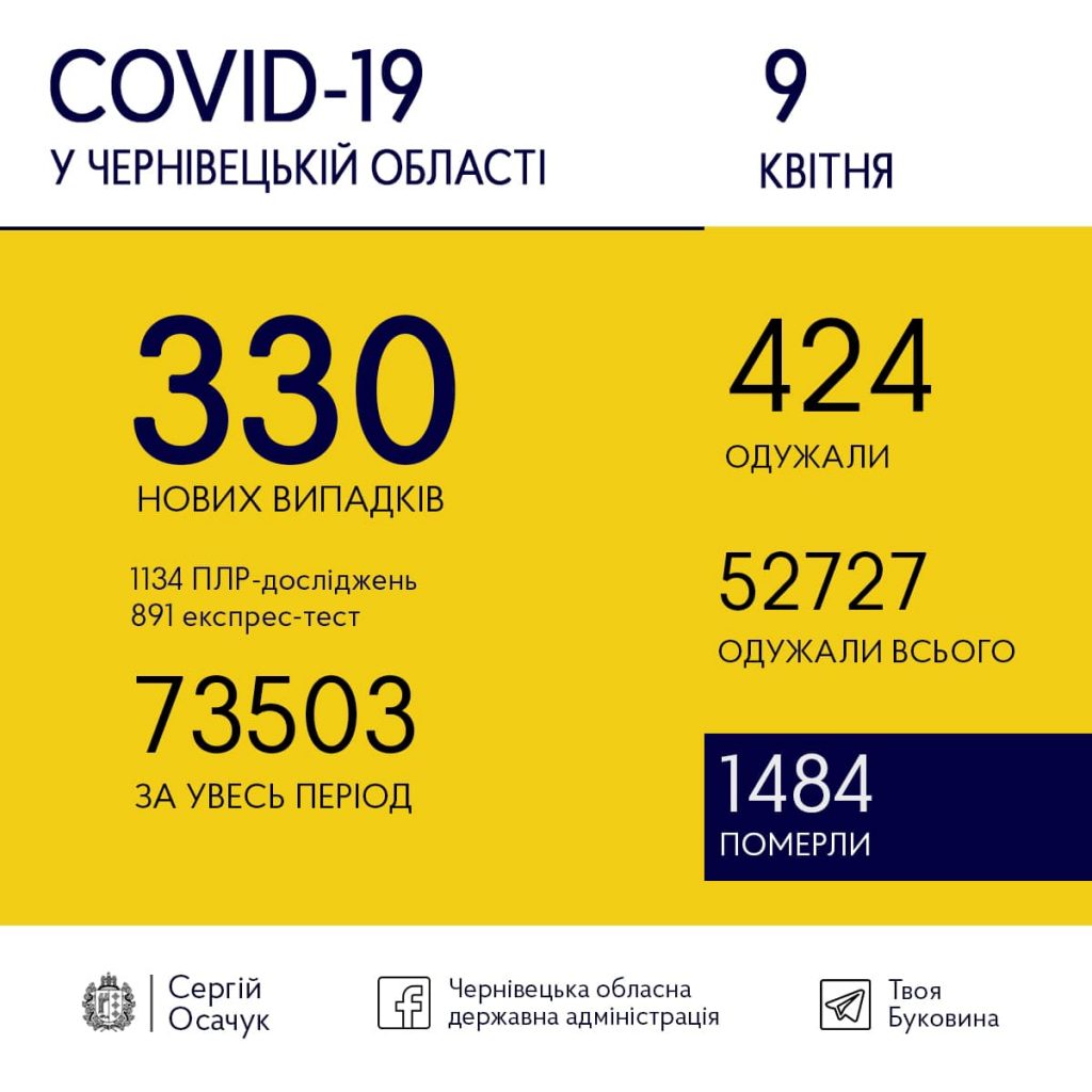 На Буковині за минулу добу, 9 квітня, коронавірус виявили у 330 осіб. Про це повідомив голова Чернівецької ОДА Сергій Осачук.