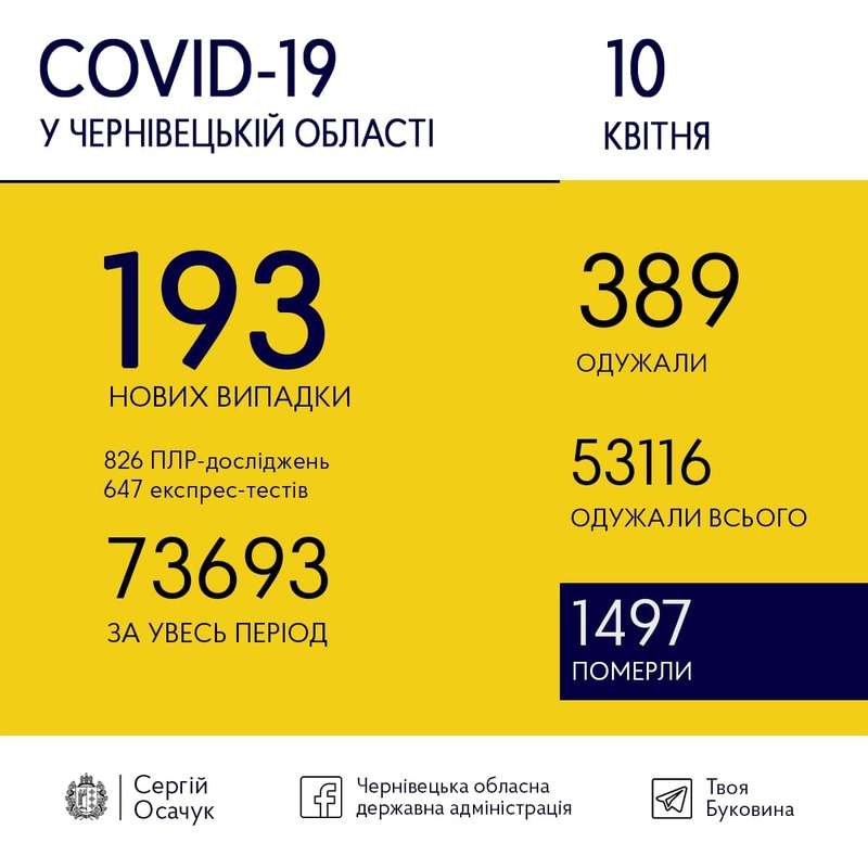 10 квітня на Буковині виявили 193 нових випадки коронавірусу.