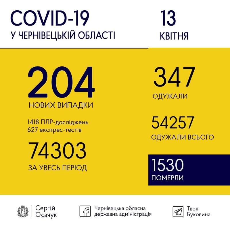 13 квітня на Буковині виявили 204 нових випадки коронавірусу.