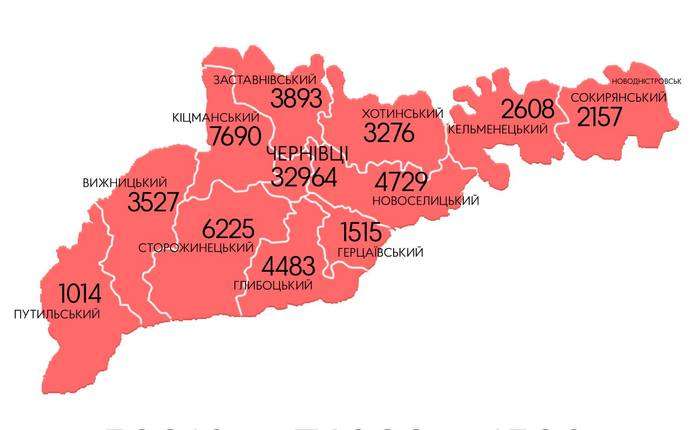 Найбільше інфікованих у Чернівцях (32964), Кіцманському (7690), Сторожинецькому (6225), Глибоцькому (4483), Новоселицькому (4729), Заставнівському (3893), Хотинському (3276) районах. Найменше людей заразилися на Путильщині (1014).