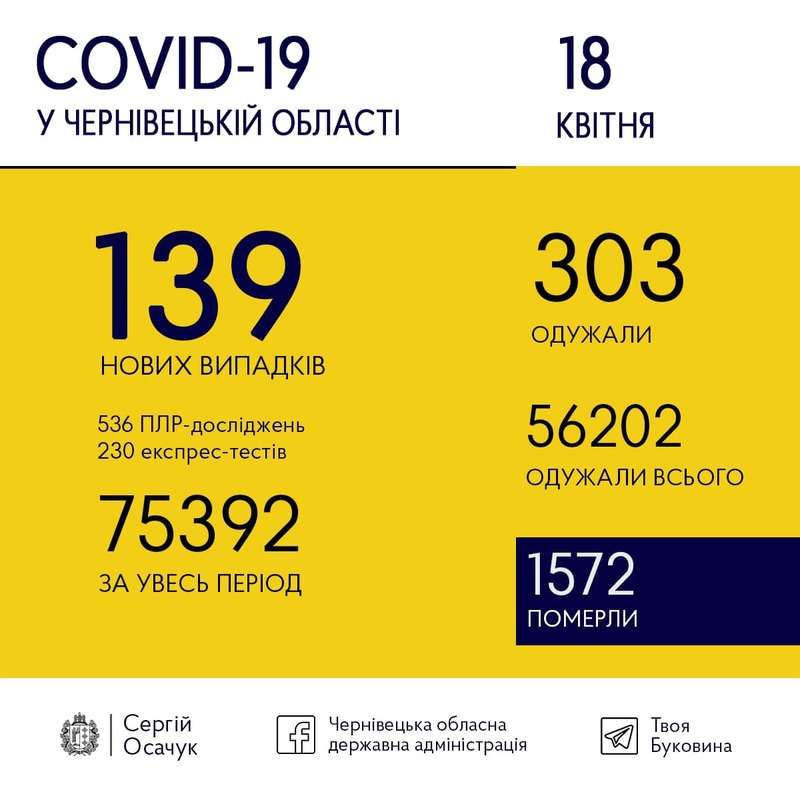 18 квітня на Буковині виявили 139 нових випадків коронавірусу.