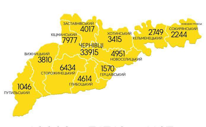 Найбільше інфікованих у Чернівцях (33915), Кіцманському (7977), Сторожинецькому (6434), Глибоцькому (4614), Новоселицькому (4951), Заставнівському (4017), Хотинському (3415) районах. Найменше людей заразилися на Путильщині (1046).
