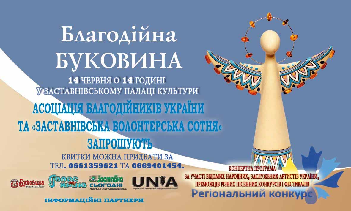 14 червня о 14 годині у Заставнівському Палаці культури відбудеться урочиста церемонія нагородження переможців Національного та Регіонального конкурсів “Благодійна Україна”, “Благодійна Буковина”.