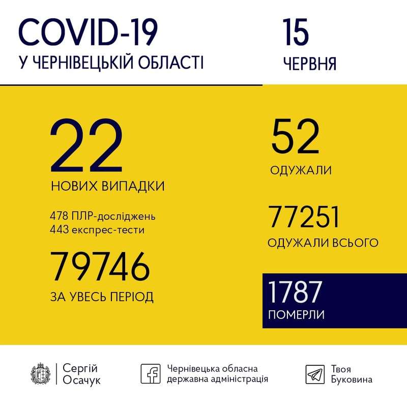Одужали цього дня 52 особи.Таким чином з початку пандемії у Чернівецькій області діагностували 79746 випадків захворювання на коронавірус, 77251 особа одужала, 1787 людей померли.