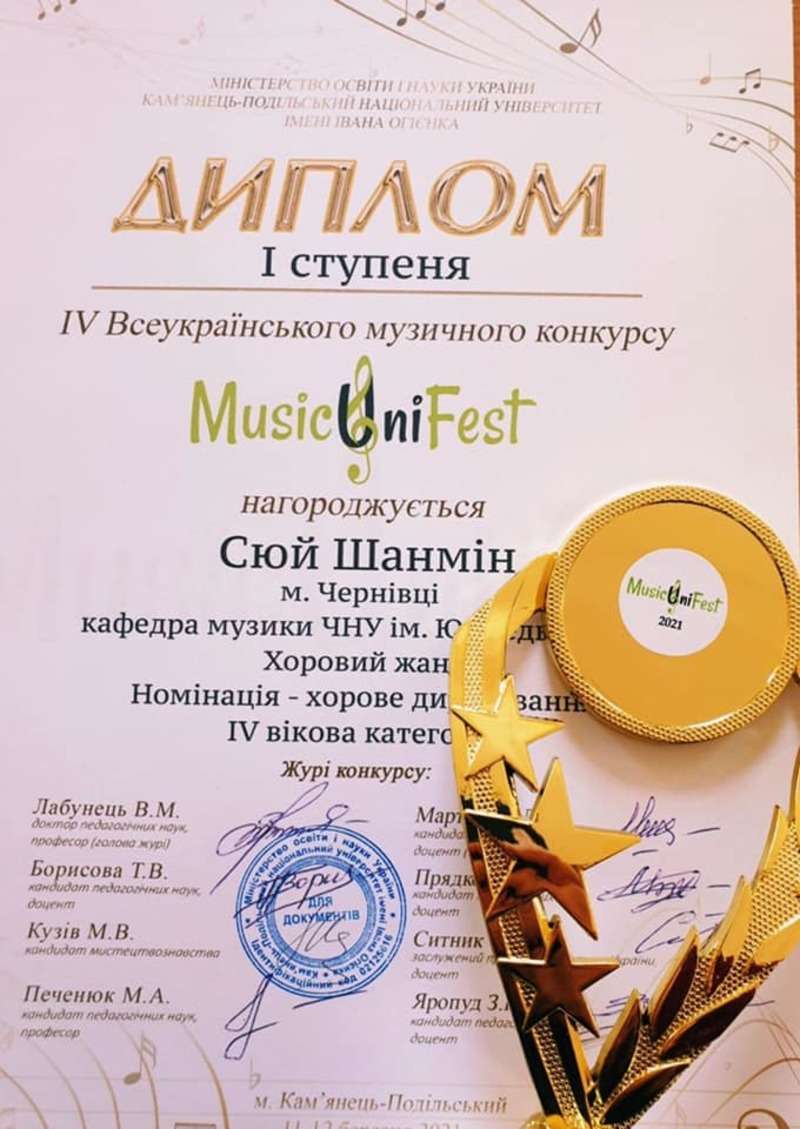 Студент 4 курсу кафедри музики Чернівецького національного університету імені Юрія Федьковича Сюй Шанмін взяв участь у IV Всеукраїнському музичному конкурсі «MusicUniFest-2021», який проводився на базі кафедри музичного мистецтва Кам’янець-Подільського національного університету імені Івана Огієнка.