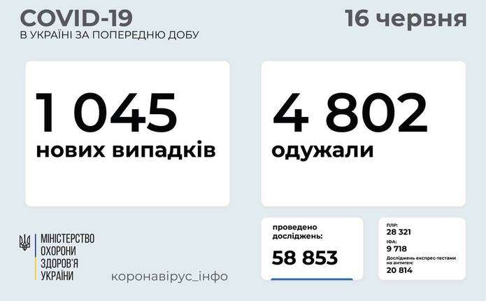 1 045 нових випадків коронавірусної хвороби COVID-19 зафіксовано в Україні станом на 16 червня 2021 року. Зокрема, захворіли 46 дітей та 23 медпрацівники. Про це інформує телеграм-канал Коронавірус Інфо.