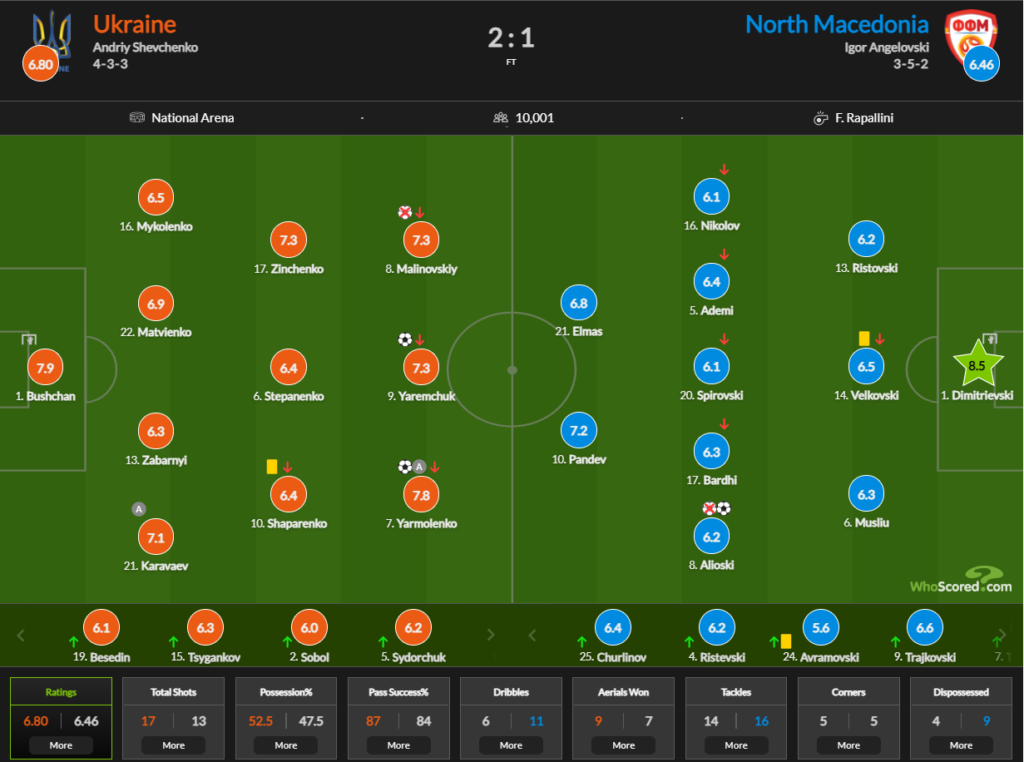 Саме тому загроза воротам Столе Дімітревського (голкіпер збірної Північної Македонії) переважно приходила з правого флангу нападу нашої команди. Між собою там обігрувалися Ярмоленко, Караваєв, які активно прострілювали у воротарський майданчик македонців на Яремчука. Розпочинав ці атаки, як правило, Руслан Малиновський, який приходив із лівого флангу на свою звичну позицію в центрі поля.