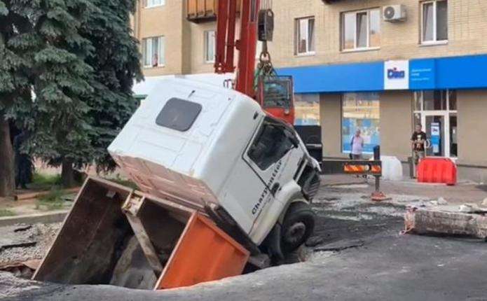 Зазначається, що пригода сталася під час ремонтних робіт з відновлення асфальтного покриття. Завантажена будматеріалами вантажівка провалилася у технічне підвальне приміщення, яке давно пустувало.