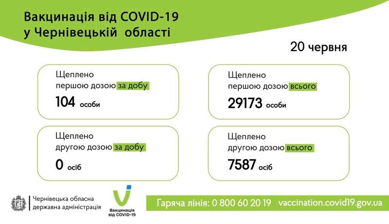 Загалом у Чернівецькій області від коронавірусу станом на 20 червня першою дозою вакцинували 29173 буковинця, другу дозу отримали 7587 осіб.