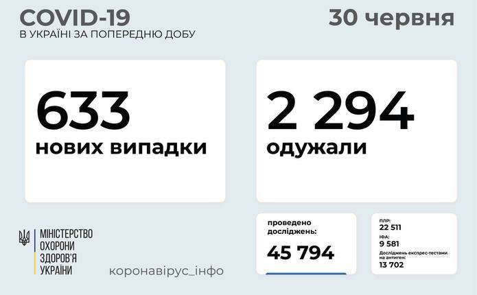 633 нових випадки коронавірусної хвороби COVID-19 зафіксовано в Україні станом на 30 червня 2021 року. Зокрема, захворіли 31 дитина та 19 медпрацівників. Про це інформує телеграм-канал Коронавірус Інфо.