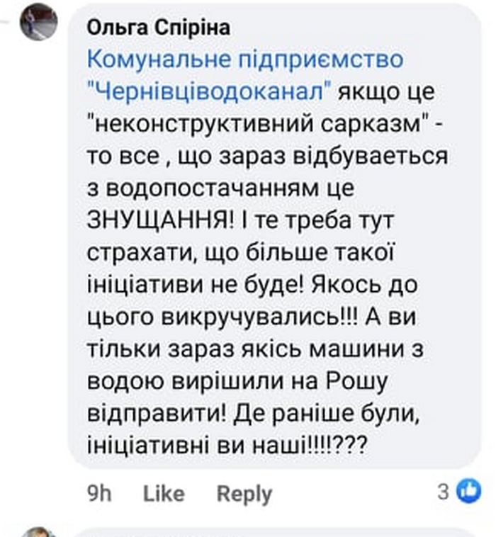 «Якщо це “неконструктивний сарказм” – то все , що зараз відбувається з водопостачанням це ЗНУЩАННЯ! І не треба тут страхати, що більше такої ініціативи не буде! Якось до цього викручувались! А ви тільки зараз якісь машини з водою вирішили на Рошу відправити! Де раніше були, ініціативні ви наші?», – написала у відповідь Ольга Спіріна.