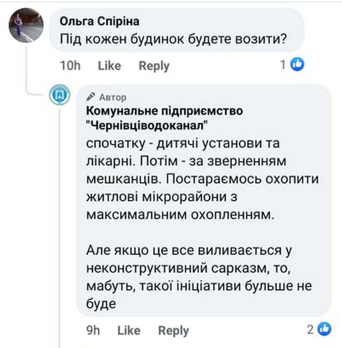 «Постараємось охопити житлові мікрорайони з максимальним охопленням. Але якщо це все виливається у неконструктивний сарказм, то, мабуть, такої ініціативи більше не буде», – пригрозили у водоканалі.