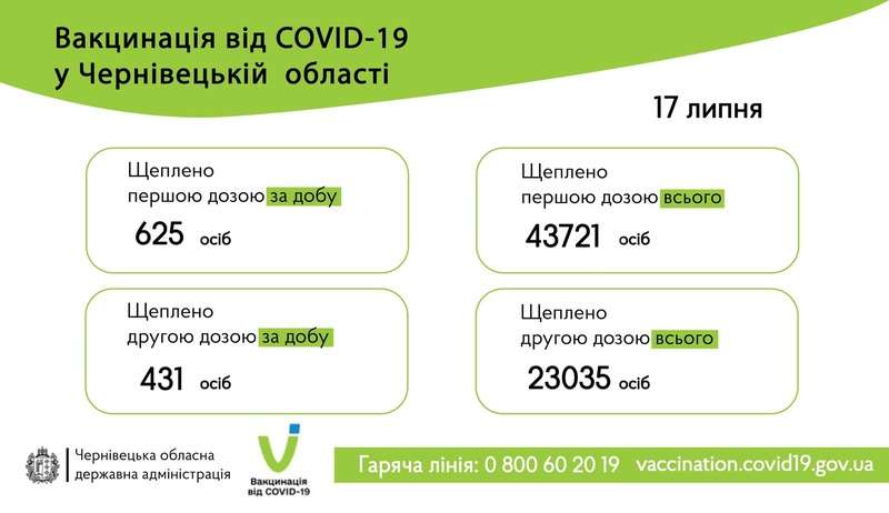 17 липня, у Чернівецькій області від COVID-19 щепили всього 1056 осіб, у тому числі: першою дозою – 625, другою дозою – 431.