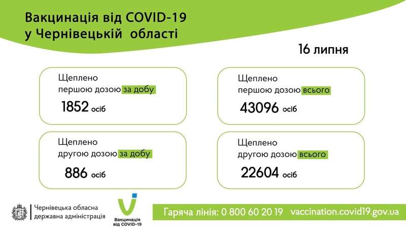 16 липня, у Чернівецькій області від COVID-19 щепили всього 2738 осіб, у тому числі: першою дозою – 1852, другою дозою – 886.