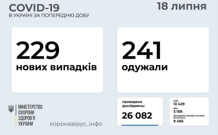 229 нових випадків COVID-19 зафіксовано в Україні станом на 18 липня 2021 року. Зокрема, захворіли 27 дітей та 4 медпрацівники. Про це інформує телеграм-канал Коронавірус Інфо.