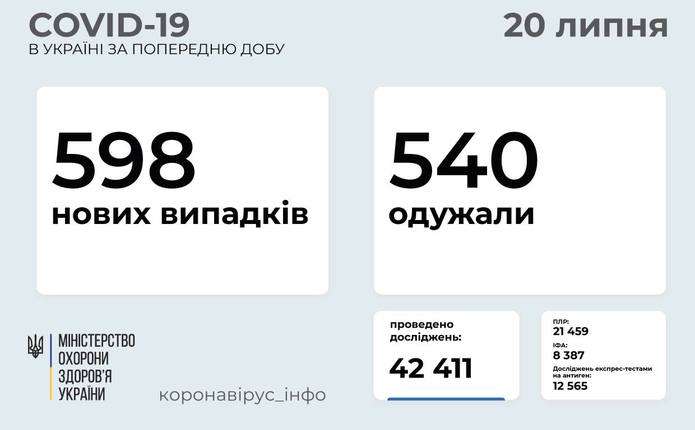 598 нових випадків COVID-19 зафіксовано в Україні станом на 20 липня 2021 року. Зокрема, захворіли 23 дитини та 13 медпрацівників. Про це інформує телеграм-канал Коронавірус Інфо.