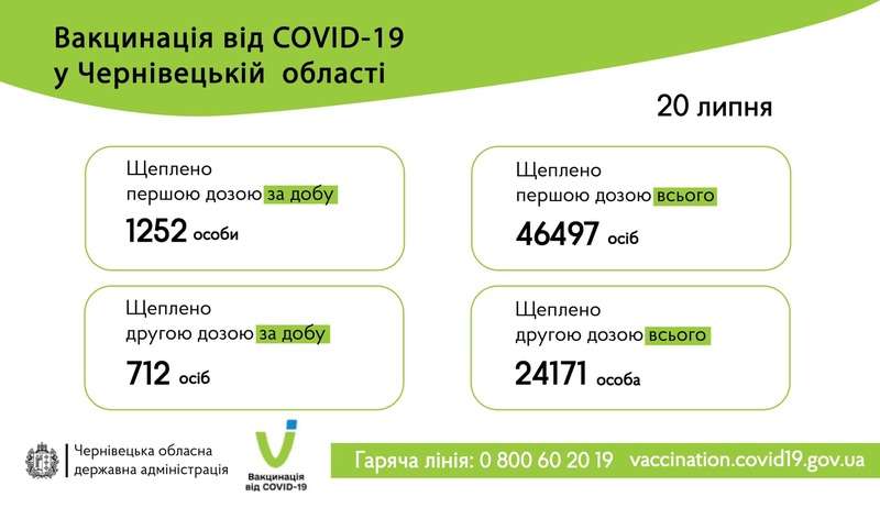 20 липня, у Чернівецькій області від COVID-19 щепили 1964 особи, у тому числі: першою дозою – 1252, другою дозою – 712.