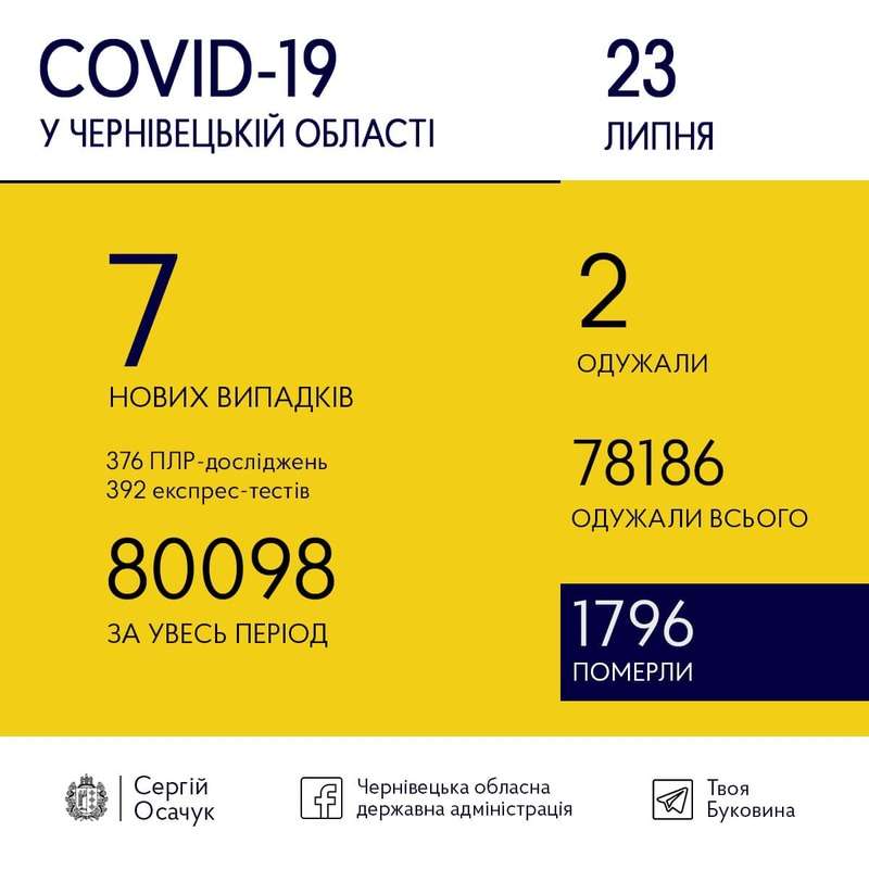 23 липня на Буковині виявили 7 нових випадків коронавірусу.
