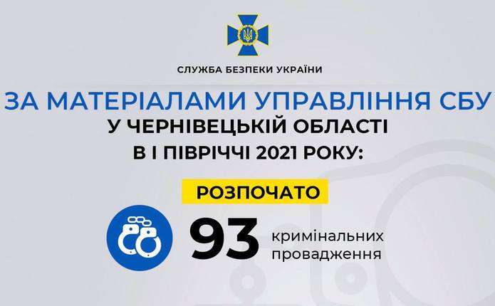 93 кримінальні провадження з початку 2021 року за матеріалами Управління СБ України в Чернівецькій області відкрили СБУ та інші правоохоронні органи.