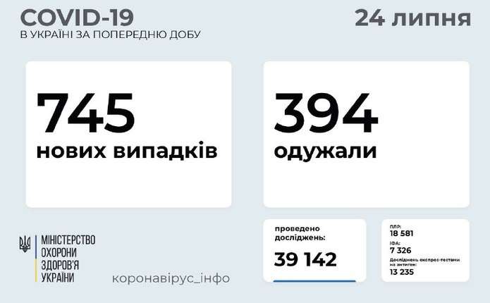 745 нових випадків COVID-19 зафіксовано в Україні станом на 24 липня 2021 року. Зокрема, захворіли 51 дитина та 20 медпрацівників. Про це інформує телеграм-канал Коронавірус Інфо.