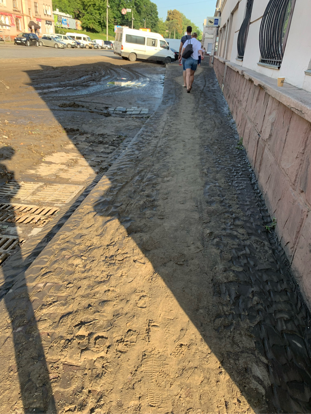 Сьогодні зранку, коли приїхали ранкові потяги, туристи змушені були подолати спочатку болото, щоб потрапити до зупинки громадського транспорту чи таксі.