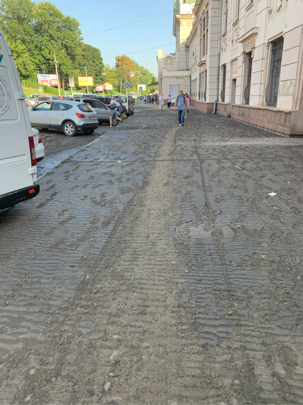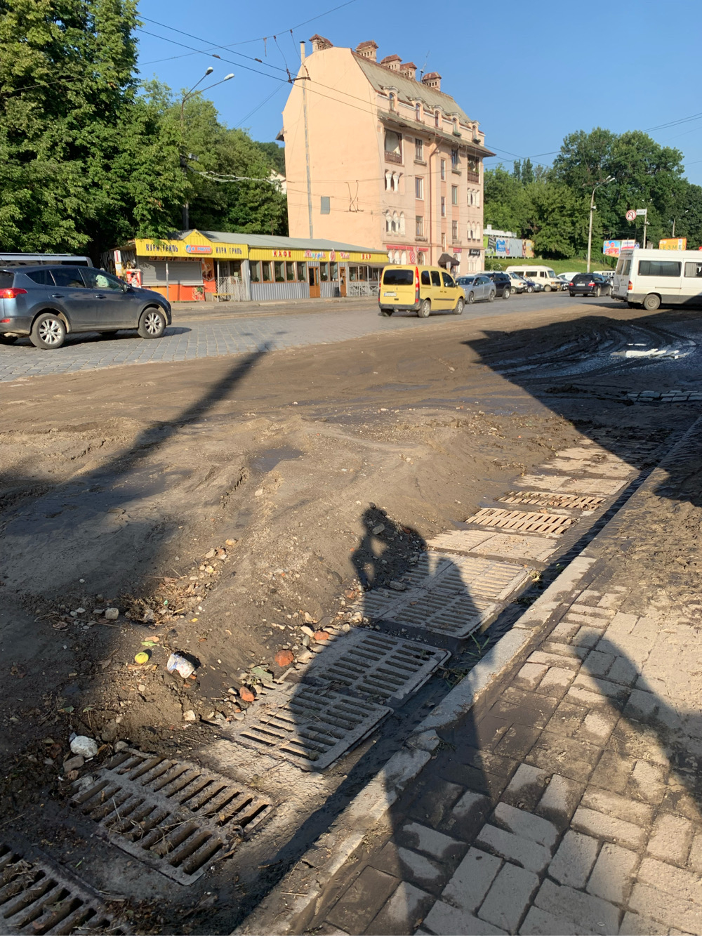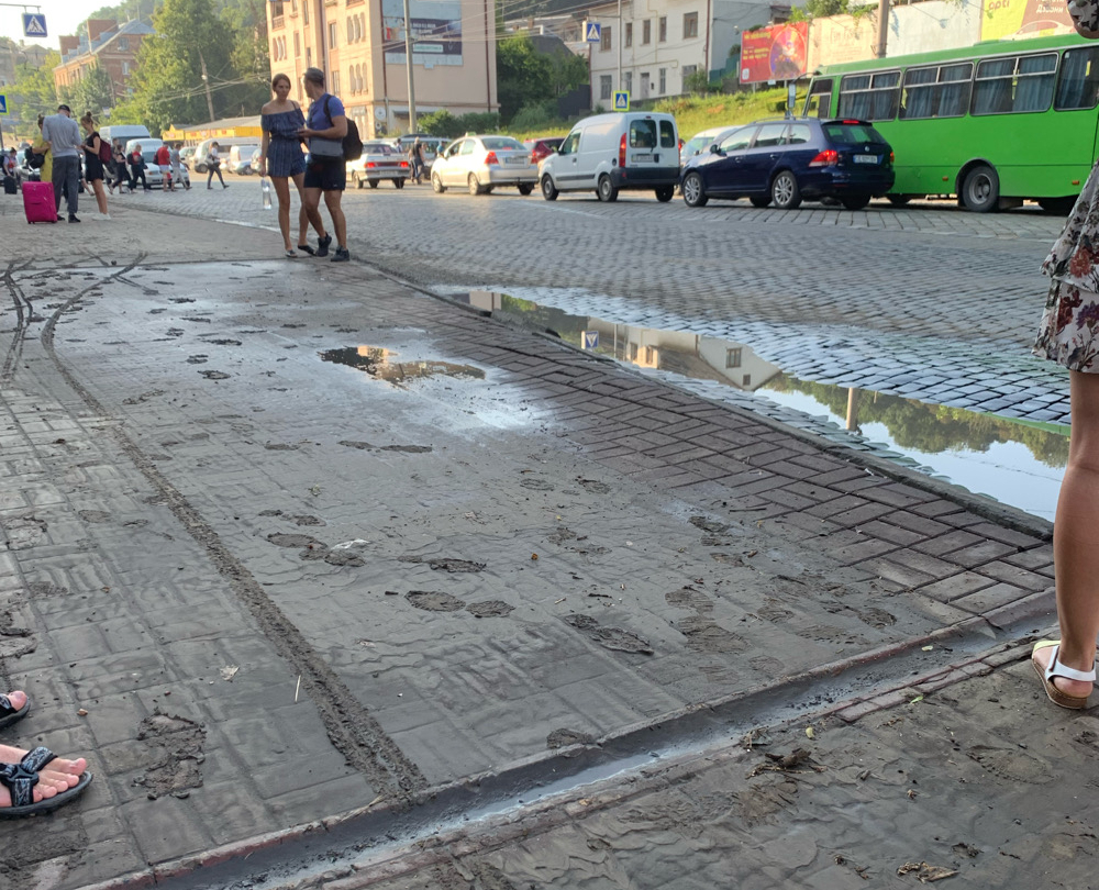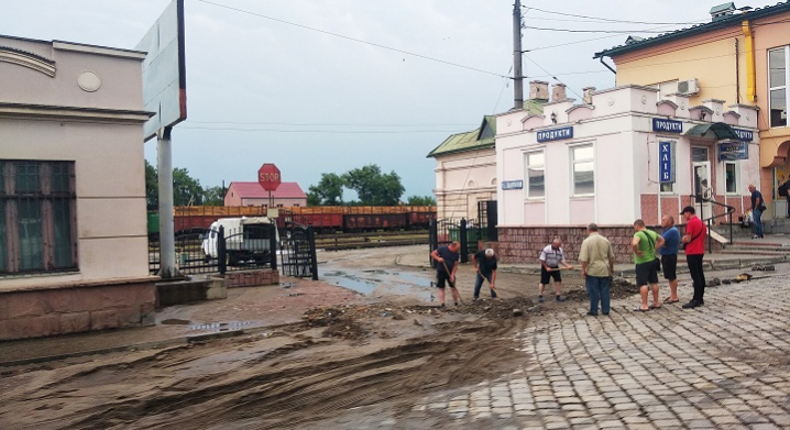 Після вчорашньої зливи вода затопила декілька вулиць та залізничний вокзал. Після того, як вода зійшла, залишилось багато намулу, сміття та піску. Проте оперативно прибрати не вдалося.