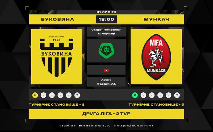 У суботу, 31 липня, у матчі 2 туру Другої ліги ФСК «Буковина» у Чернівцях прийматиме «Мункач» (Мукачево, Закарпатська область). Початок гри на стадіоні «Буковина» о 18:00. Матч обслуговуватиме бригада арбітрів, яку очолює 27-річний Андрій Федорук із Київської області. Про це повідомляє bukfc.com.