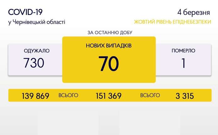 За минулу добу, 4 березня 2022 року, на Буковині зафіксовано 70 нових випадків зараження коронавірусом.