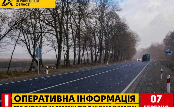 Станом на ранок 7 березня усі дороги державного значення Чернівецької області у проїзному стані. Жодних обмежень у русі немає. Вся дорожня інфраструктура нашої області працює стабільно. Про це повідомляє Служба автомобільних доріг у Чернівецькій області.