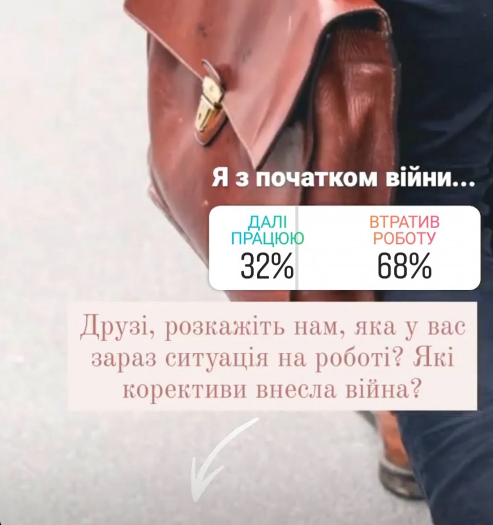Ми опитали наших підписників у соцмережах. Відгукнулися 470 людей. 68% із них втратили роботу з початком війни. Решта – продовжують свою діяльність, проте всі на різних умовах.
