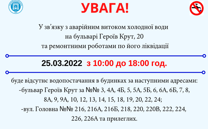 25 березня 2022 року у Чернівцях в зв’язку з проведенням ремонтних робіт по ліквідації витоку води на бульварі Героїв Крут, 20 з 10.00 до 18.00 год. буде відсутнє водопостачання на будинки наступних вулиць: