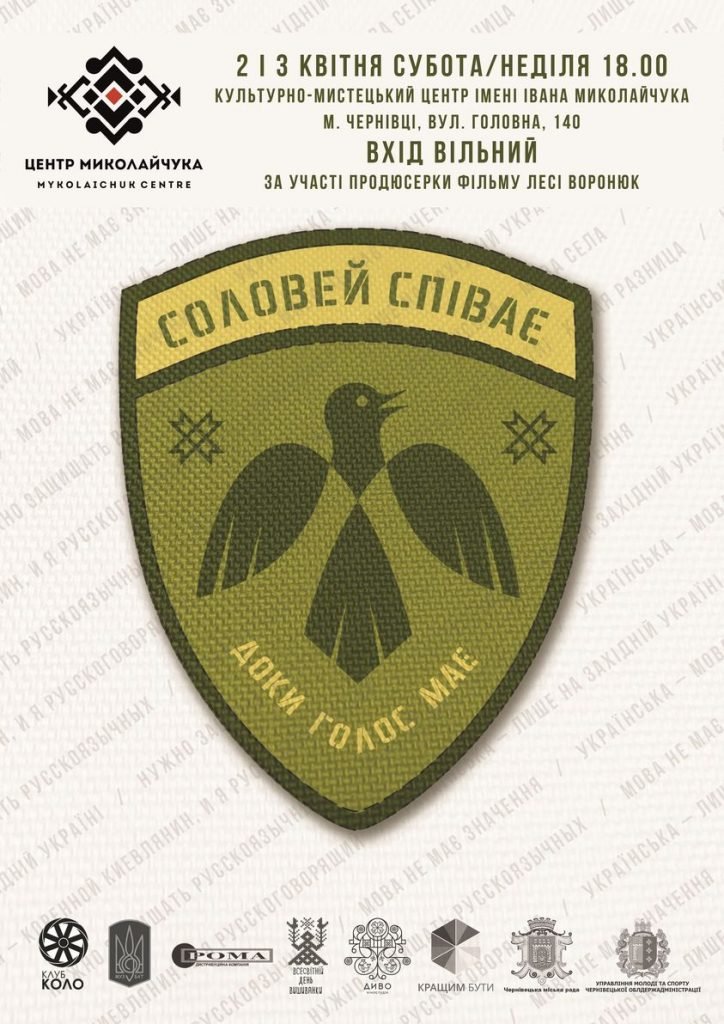2 та 3 квітня у культурно-мистецькому центрі імені Івана Миколайчука у Чернівцях покажуть документальний фільм «Соловей співає. Доки голос має». Початок о 18:00.
