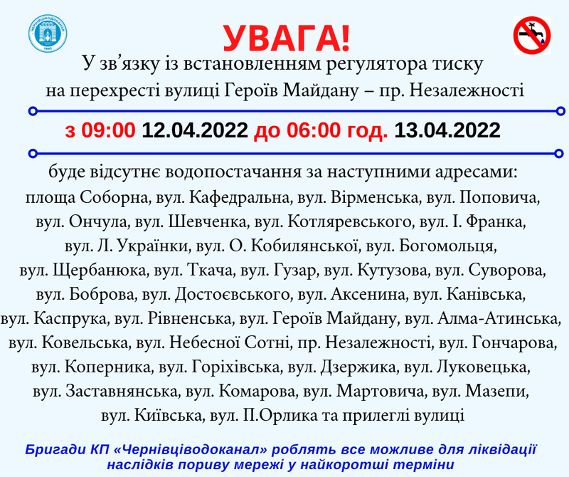 У Чернівцях, в зв’язку із встановленням регулятора тиску на перехресті Г. Майдану – Пр. Незалежності «Кільце», буде відсутнє водопостачання з 9:00 год. 12 квітня по 6:00 год. 13 квітня 2022 року за наступними адресами:
