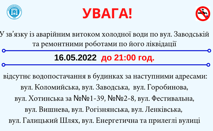 16 травня 2022 року у Чернівцях, в зв’язку з ремонтними роботами по ліквідації витоку холодної води на вул. Заводській біля н. ст. «Рогізна», до 21.00 год. без водопостачання будуть будинки на наступних вулицях: