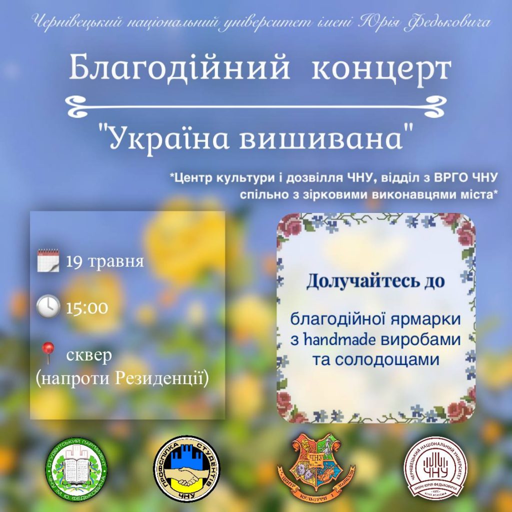 Сьогодні, 19 травня, у сквері навпроти ЧНУ відбудеться благодійний концерт «Україна вишивана». Захід розпочнеться о 15:00.