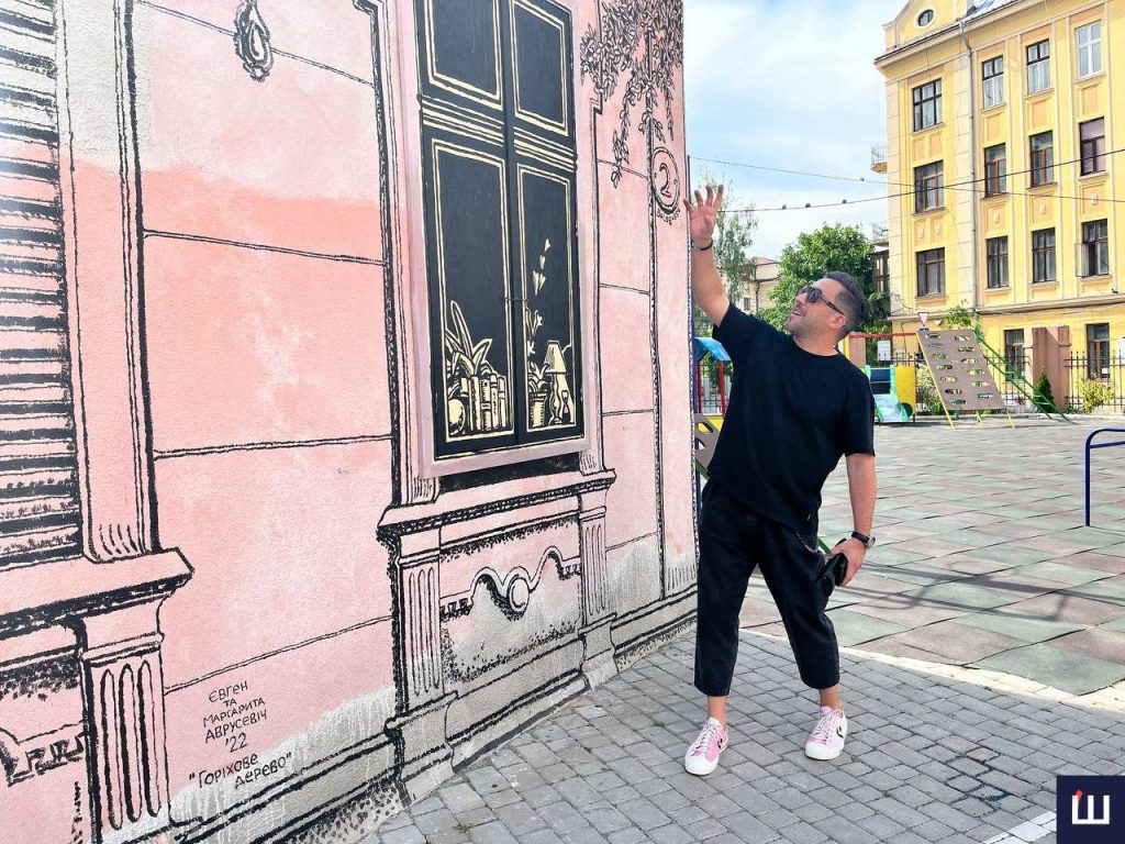 «У 2016 році вийшла книга «Горіхове дерево». Це – мемуари єврейської дівчинки, яка жила у Чернівцях у міжвоєнний період. Вона описувала свої відчуття під час проживання тут. Отже на стіні зображено шматок фасаду будинку, де вона жила. А це вікно – було транзитом вражень від зовнішнього світу. Тут, на стіні, саду немає. Проте у дівчинки був сад свій – внутрішній. Тож, коли ми відчиняємо вікно, ми бачимо той яскравий внутрішній сад, який був у цієї дівчинки», — розповів митець.