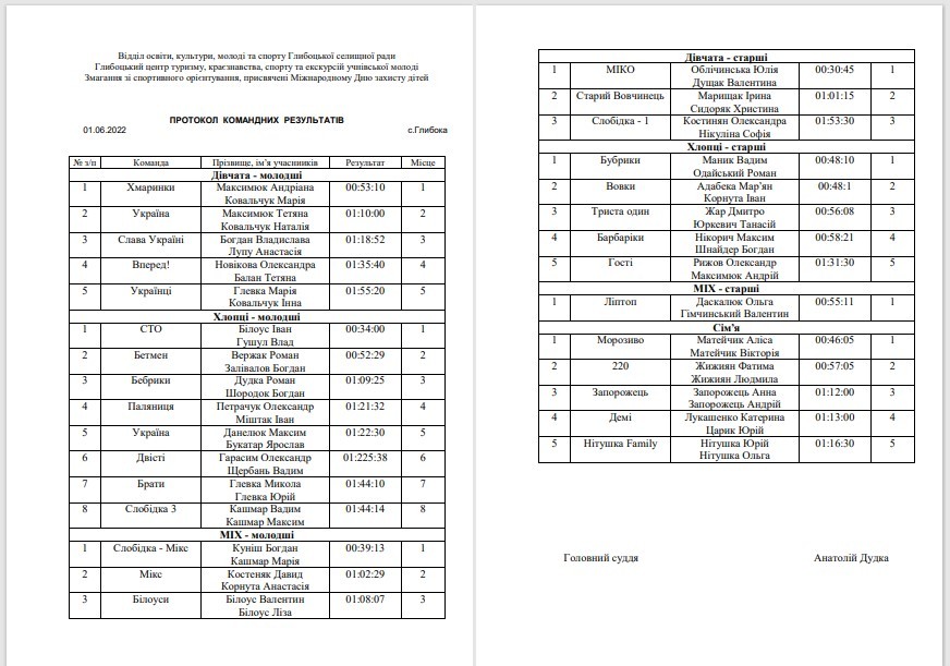 У рамках відзначення Міжнародного Дня захисту дітей Глибоцький центр туризму, краєзнавства, спорту та екскурсі учнівської молоді організував та провів цікаві естафетні змагання з паркового орієнтування. Учасники змагались у молодшій (до 14 років) та старшій (від 14 років) вікових групах серед юнаків, дівчат та змішаних пар. Родзинкою виявились змагання у категорії «Сім’я».